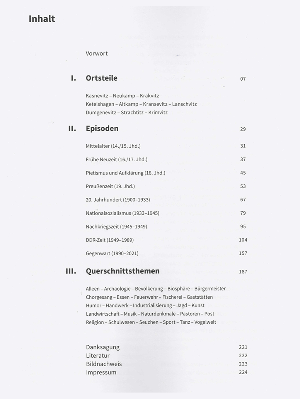 Die derzeit jüngste Erfolgsgeschichte ist das Dorfgemeinschaftshaus, zu dessen Eröffnung im Juni die neue Chronik vorgestellt wird. Sie schließt alle Dörfer der ehemaligen Gemeinde Kasnevitz ein, von Kransevitz und Ketelshagen bis Altkamp, von Krakvitz bis Dumgenevitz, von Glowitz und Neukamp bis Lanschvitz, Krimvitz und Strachtitz.